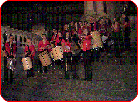 Full band on the steps of the Victoria Monument in Liverpool